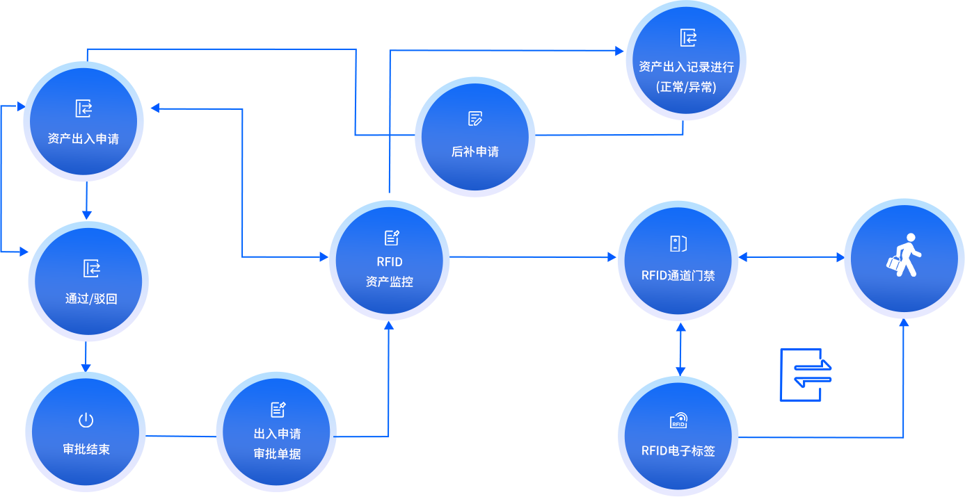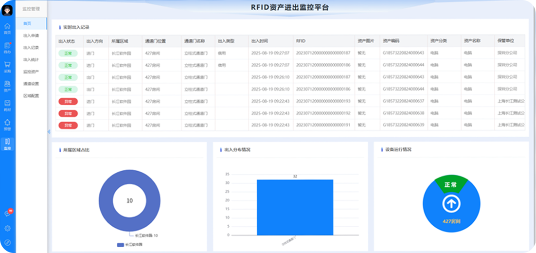 ◆ 资产系统与RFID读写器进行实时通信,对企业内固定区域的资产状态监控,并可进行位置报警。