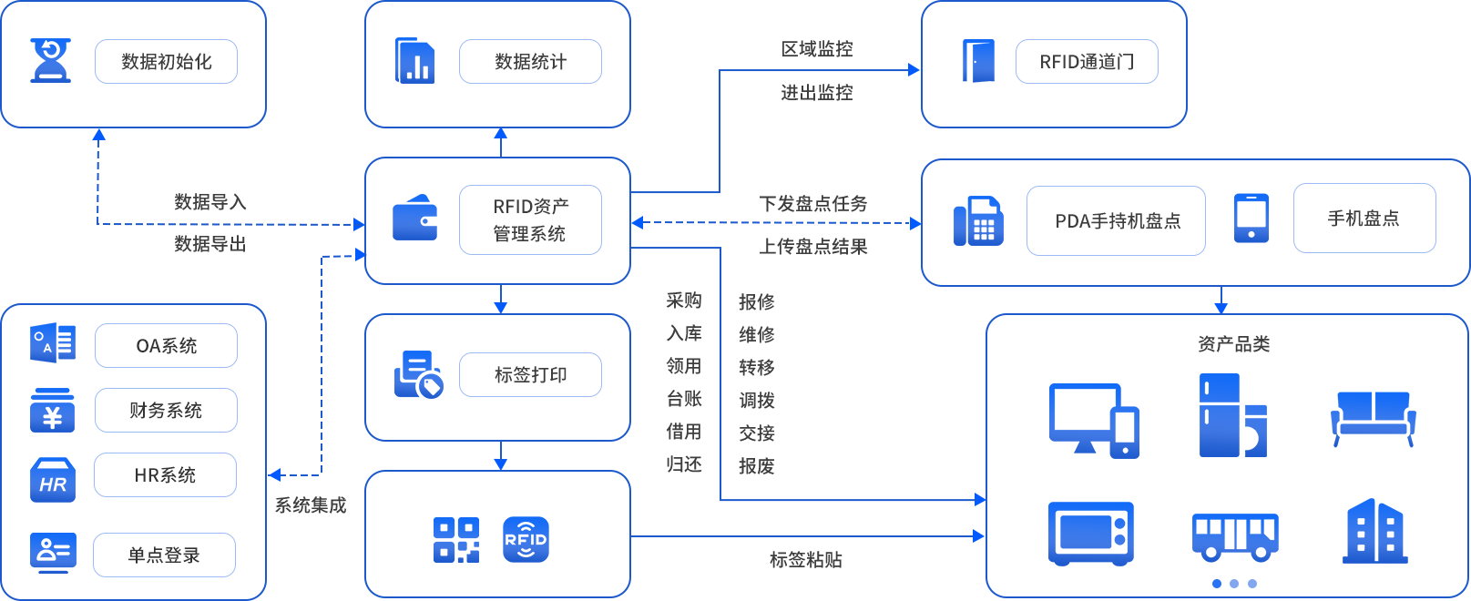 • 包含了资产入库、领用、退库、借用归还、转移、调拨、报修、维修、报废等全流程管理